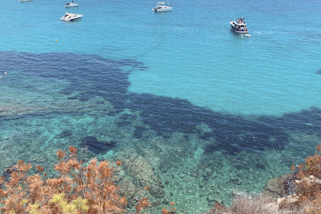 Cala L’Andrago is a pebbly cove with beautifully clear water, perfect if you have older kids who enjoy snorkelling and do not mind wearing water shoes. The rocky seabed attracts fish and makes the underwater landscape more interesting to explore with a mask. You will also find some beach bars and restaurants nearby, making it easy to combine a swim with a relaxed lunch or sunset drink.